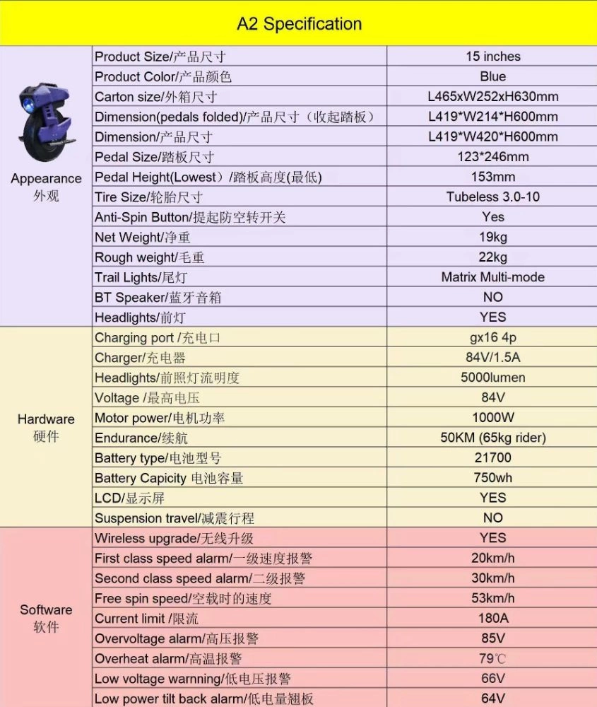 Non lasciatevi ingannare dalle specifiche robuste. Le dimensioni compatte di Begode A2 lo rendono ideale per gli spostamenti quotidiani. La sua estetica robotica e futuristica vi farà sicuramente notare mentre scivolate. Con un pneumatico da 15 pollici, una batteria al litio da 750Wh e un motore a coppia elevata, questo piccolo razzo blu è costruito per affrontare i rigori della vita quotidiana. L'A2 prende spunto dal design elegante del suo cugino MTEN4 e lo arricchisce con gli ultimi pad in stile EX30, conferendogli un'estetica tanto fresca quanto feroce. Ma non si tratta solo di estetica. Se siete alla ricerca di un mezzo affidabile, Begode A2 vi copre le spalle con una gamma che va ben oltre la sua classe di peso.