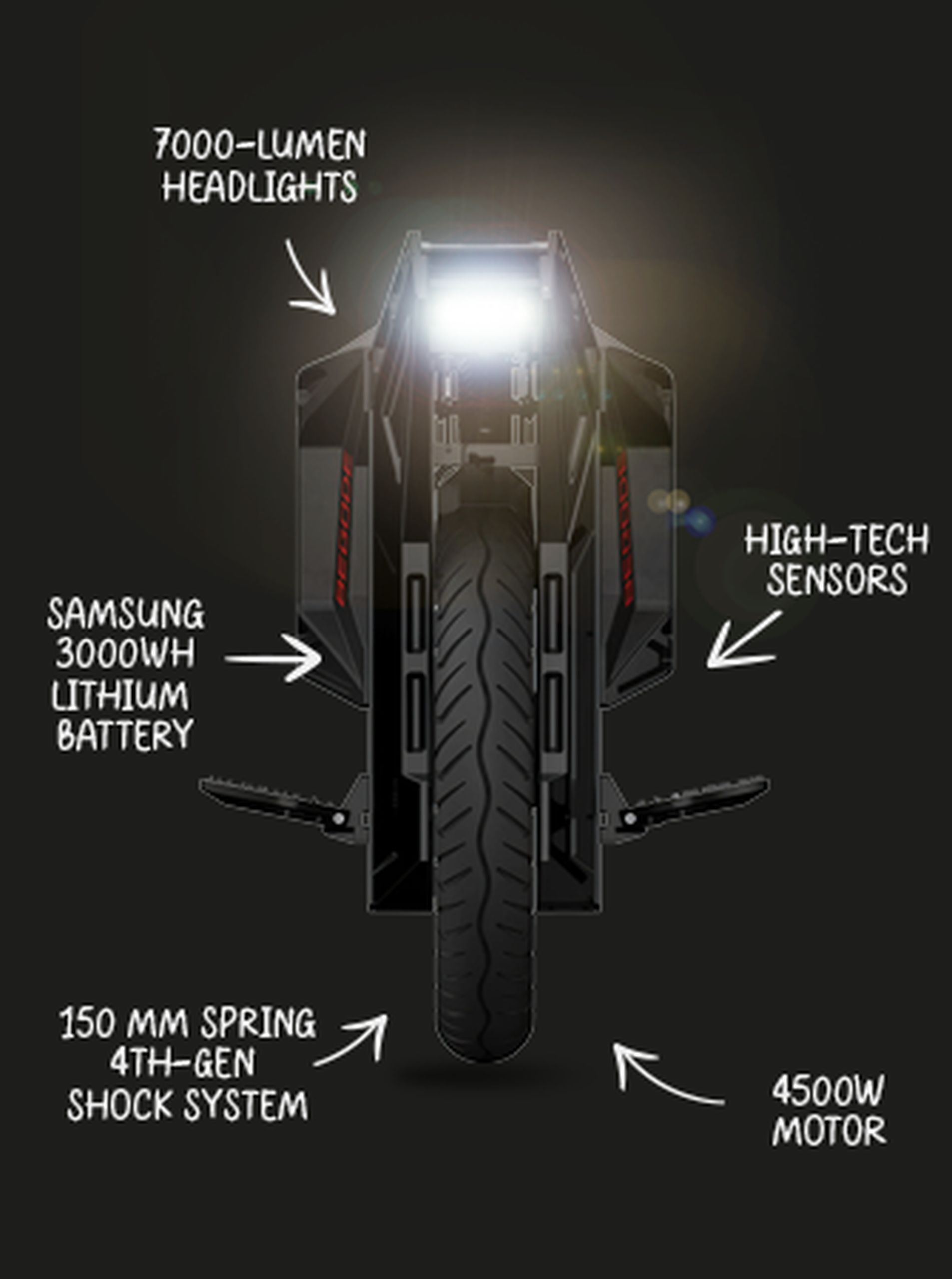 Volete fare una pausa? Grazie al cavalletto integrato, il vostro Begode ET Max si riposa facilmente come voi. Non ci si deve appoggiare, non ci si deve sdraiare: basta metterlo accanto a voi, pronto per la prossima tappa del vostro viaggio. I fari da 7000 lumen guidano il vostro cammino, assicurando che ogni viaggio sia tanto sicuro quanto esaltante