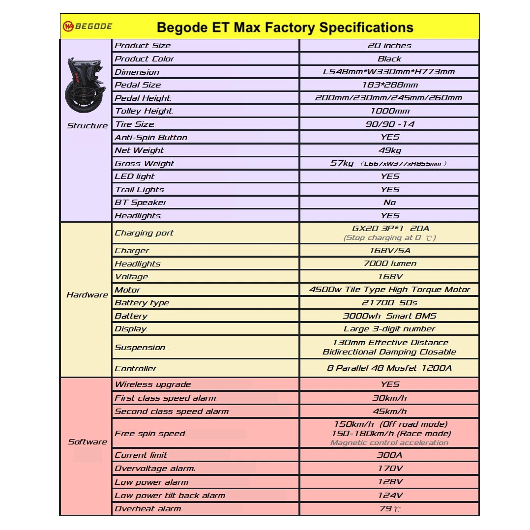 Preparatevi a strappare le piste sterrate con Begode ET Max, un dispositivo che riscrive le regole dei monocicli elettrici. Con le sue ruote da 20 pollici, predisposte per pneumatici sia da strada che da fuoristrada, questoè il vostro lasciapassare per una guida senza limiti