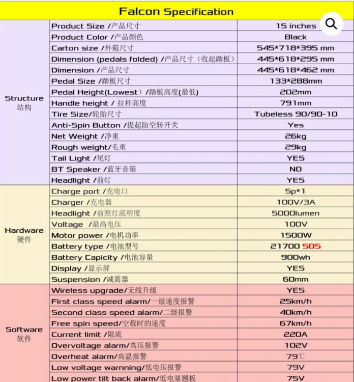 La sicurezza e la durata sono fondamentali nella progettazione del Falcon. Il telaio rinforzato in metallo e le camere della batteria garantiscono una maggiore resistenza agli urti, mentre i componenti resistenti all'acqua e i pneumatici tubeless assicurano prestazioni affidabili in diverse condizioni atmosferiche. Il manico del carrello posteriore integrato e i pedali chiodati offrono una maggiore comodità