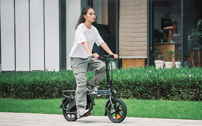 Il Fiido L3 si presenta in un elegante colore grigio con parti nere che si integrano perfettamente. Le ruote da 14 pollici e il telaio pieghevole sono pratici. La batteria di grandi dimensioni si inserisce perfettamente nel telaio, mostrando la potenza della bicicletta per percorrere la distanza. La sella, il manubrio e i freni neri si abbinano bene al telaio grigio. Anche quando è ripiegata per il viaggio, l'e-bike mantiene il suo look moderno.
