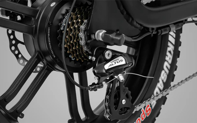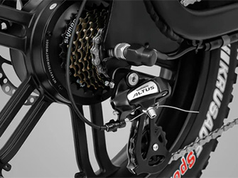 Il cambio utilizza una combinazione di ingranaggi anteriori da 46 denti e posteriori da 14 a 28 denti. Lacatena KMCè realizzata per le biciclette elettriche e dura più a lungo delle normali catene da bicicletta.