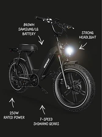 Questa bicicletta Himiway, completamente nera, è dotata di un telaio basso a gradini. È dotata di pneumatici spessi e robusti con solidi copriruota. La bicicletta è dotata di un comodo sellino imbottito e di un portapacchi posteriore per il trasporto di piccoli oggetti. Il manubrio si trova più in alto rispetto alla sella, consentendo una posizione di guida eretta e più facile per la schiena.