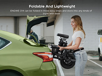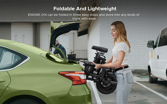 La bicicletta elettrica ENGWE O14 pesa solo 26,9 kg. È facile da trasportare e da riporre. Il suo design pieghevole consente di ridurla a 75x35x64 cm, rendendola perfetta per il trasporto nel bagagliaio dell'auto o per lo stoccaggio in spazi ridotti.