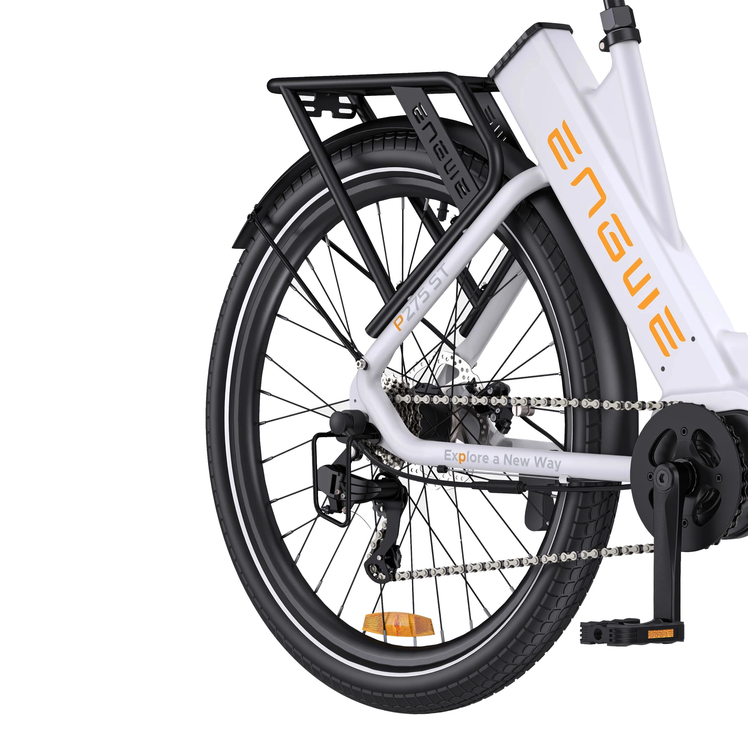 Progettata per la guida in città, la ENGWE P275 ST è dotata di freni a disco idraulici Tektro per una potenza di arresto affidabile, di un deragliatore Shimano a 9 velocità per cambi marcia fluidi e di pneumatici semi-slick a palloncino che bilanciano aderenza ed efficienza. È inoltre dotata di robusti parafanghi in lega, di un portapacchi posteriore per impieghi gravosi e di illuminazione integrata, per garantire sicurezza e praticità in qualsiasi condizione atmosferica.
