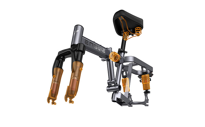 Nonostante le dimensioni compatte, ENGWE T14 non lesina sul comfort. Il sistema a tre sospensioni, forcella anteriore, telaio e reggisella, è in grado di gestire le asperità del terreno urbano. I pneumatici in gomma da 14 x 2,125 pollici sono dimensionati per l'uso in città. Offrono un'ammortizzazione sufficiente per le tipiche imperfezioni della strada senza sacrificare l'efficienza.