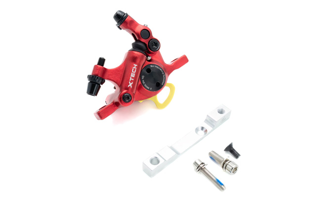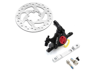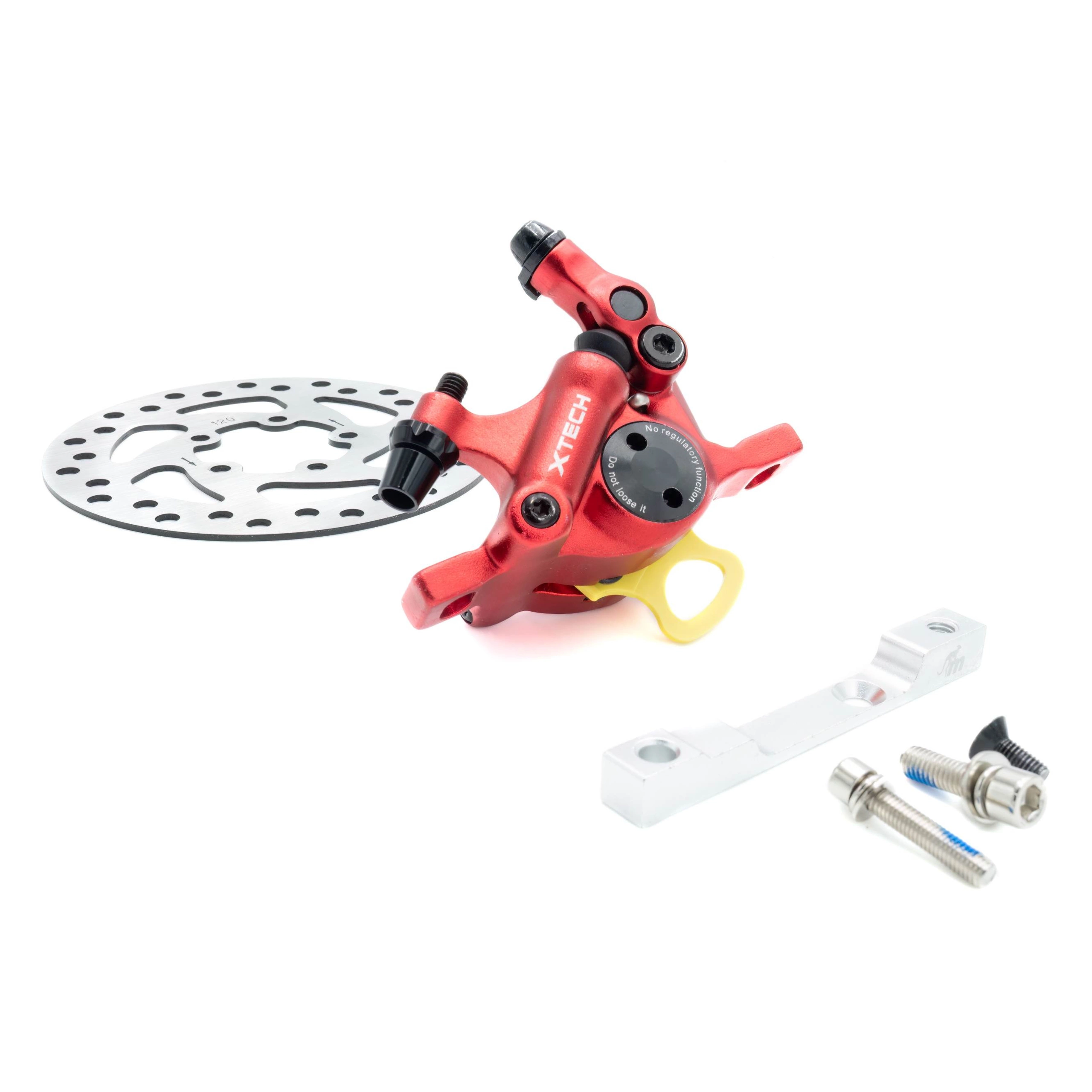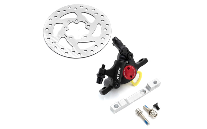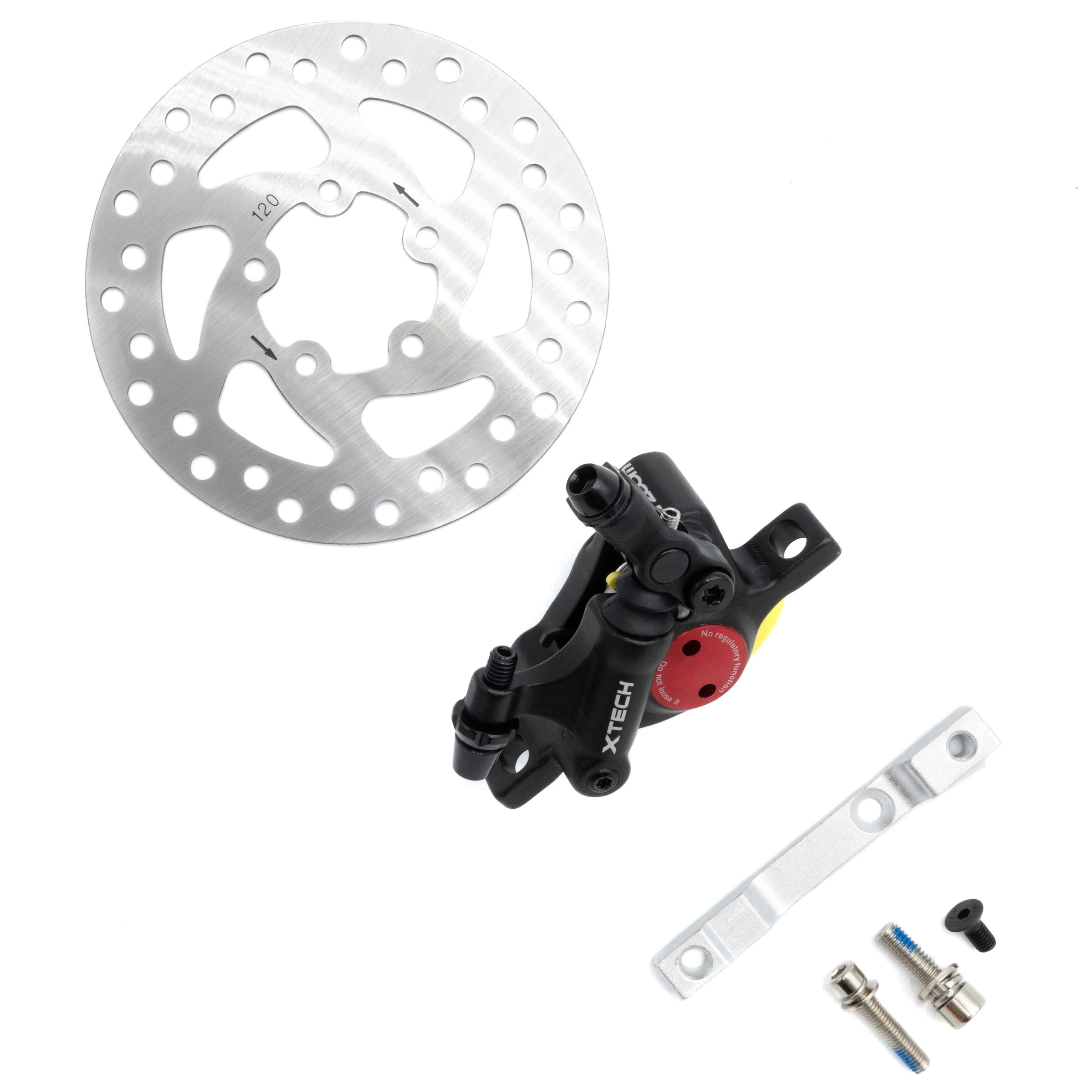 Il kit freni X-tech comprende una pinza X-tech, un distanziale per la pinza e un disco freno da 120 mm.