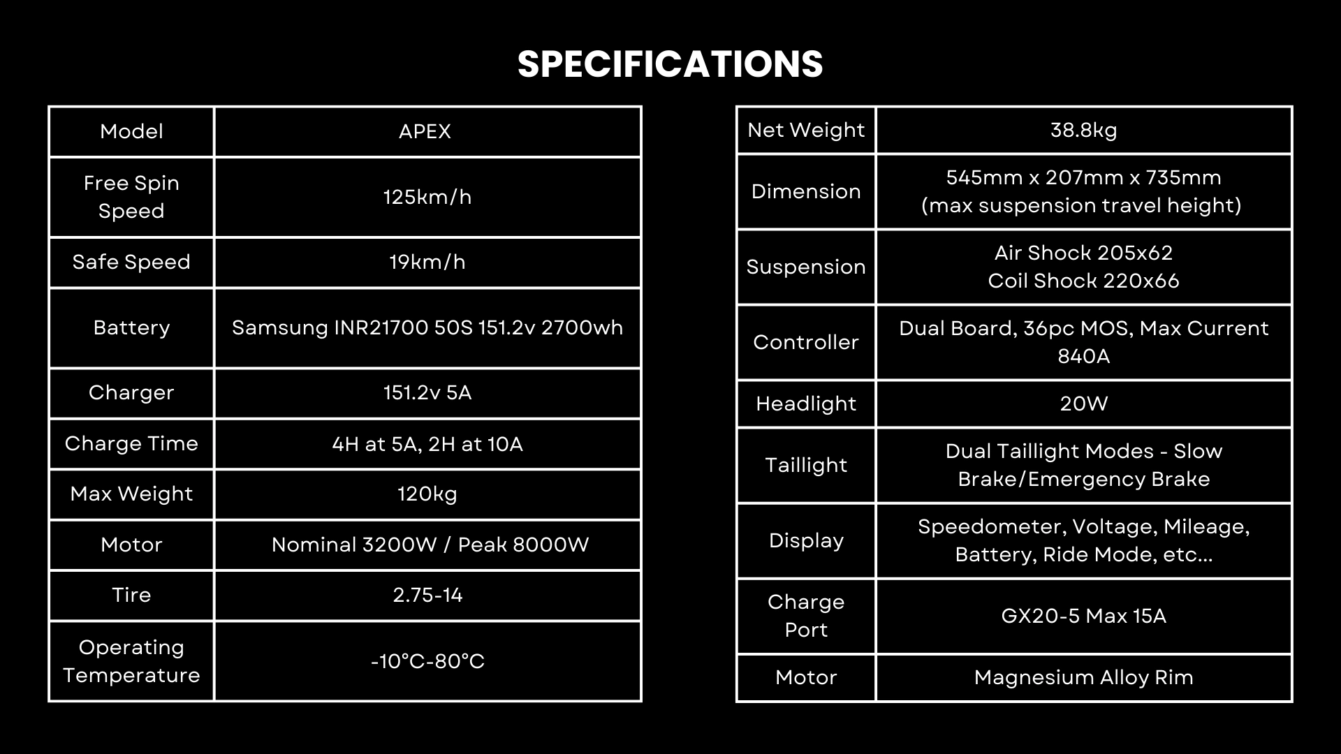 L'Apex 50S ha un motore da 3200W che può raggiungere un picco di 8000W. Questo motore è in grado di spingere l'utente su colline ripide e su terreni accidentati che potrebbero fermare ruote meno potenti. Con una velocità massima di 125 km/h, anche se non consigliamo di provarla, avrete una velocità più che sufficiente per ogni situazione.