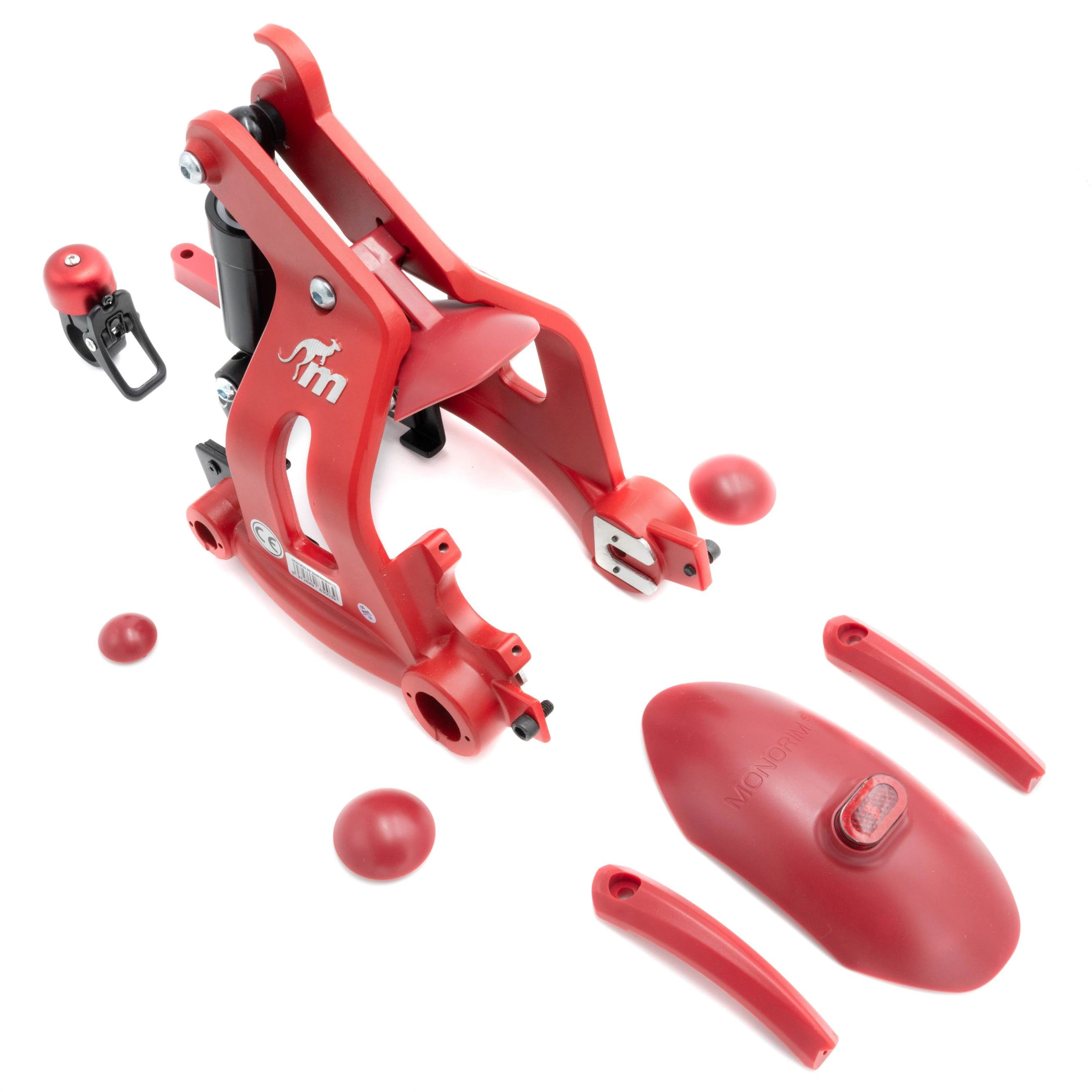 La sospensione posteriore per Xiaomi M365 è disponibile in 4 versioni di colore: nero pieno, rosso pieno o una combinazione di pistone nero e corpo rosso e pistone rosso e corpo nero. Scegliete il vostro preferito e personalizzate scooter elettrico.